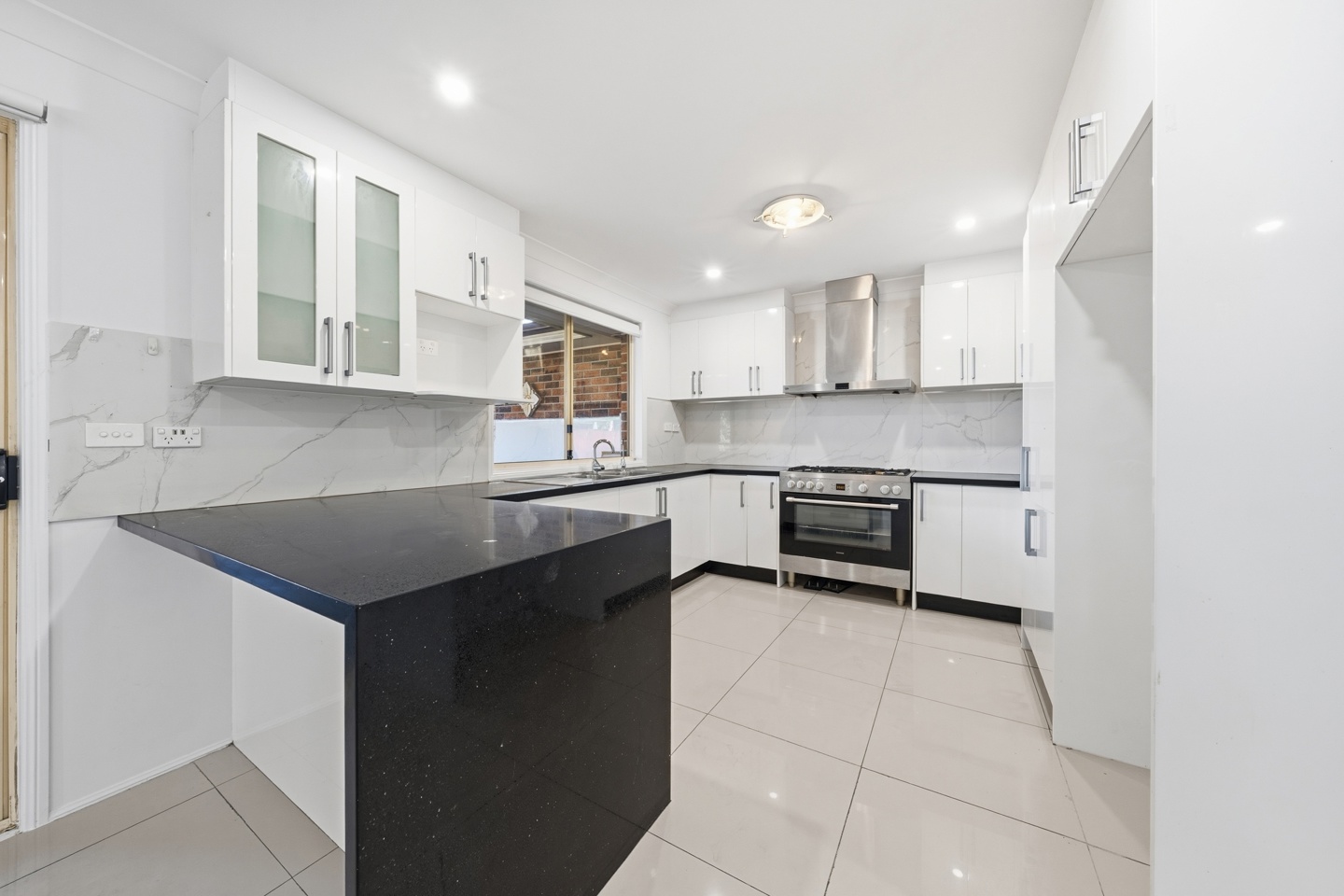 Modern kitchen featuring stone benchtops, quality appliances, and ample storage